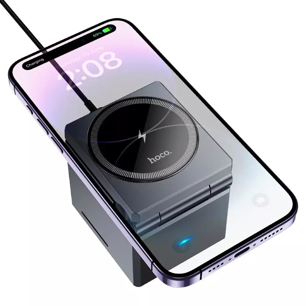 El Hoco CQ8 es un cargador inalámbrico 3 en 1 diseñado para cargar simultáneamente tu teléfono, auriculares y Apple Watch, ideal para escritorio, velador o viajes. Ofrece salida rápida para teléfonos de 5W / 7.5W / 10W / 15W, compatible con dispositivos Qi como iPhone, Samsung y más.